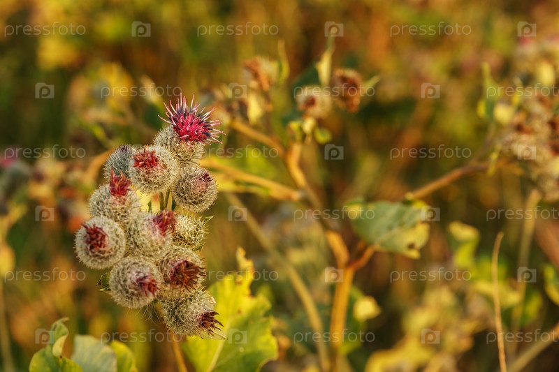 Arctium lappa обычно называют большим лопухом.Цветущие цветы лопуха на естественном фоне растений