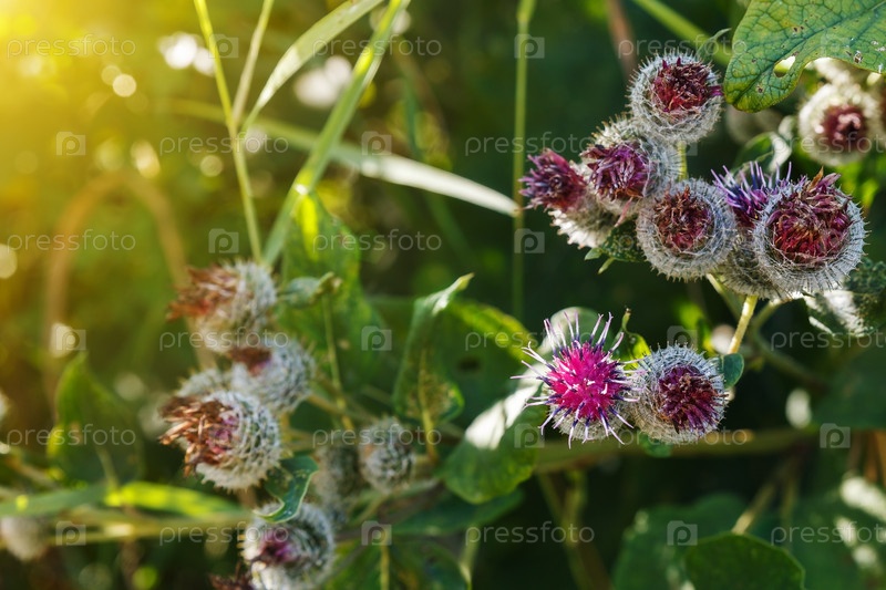 Arctium lappa обычно называют большим лопухом.Цветущие цветы лопуха на естественном фоне растений