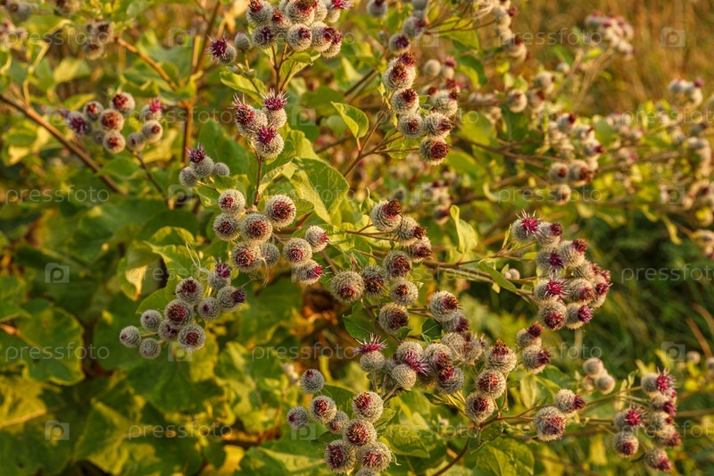 Arctium lappa обычно называют большим лопухом.Цветущие цветы лопуха на естественном фоне растений
