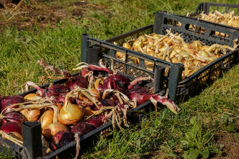 Лук в черной пластиковой коробке на траве. Уборка лука