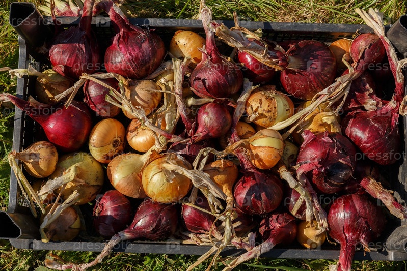 Лук выложен для сушки в черный пластиковый ящик. Сбор лука. Вид сверху