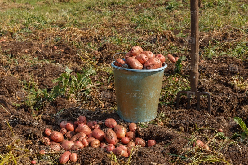 Полное ведро картофеля стоит в поле. Вилы, торчащие из земли. Уборка картофеля осенью