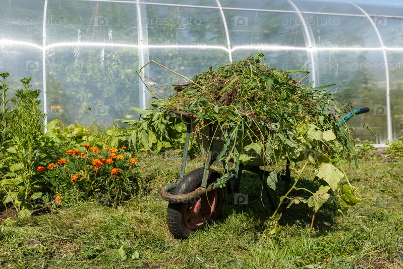Тачка в огороде. Садовая тележка в огороде, наполненная скошенной травой. Уборка сорняков в саду
