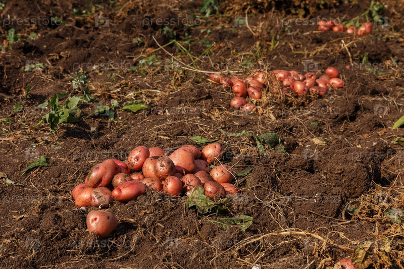 Кучи недавно собранного картофеля на поле. Сбор корней картофеля из почвы в домашнем саду. Органическое земледелие