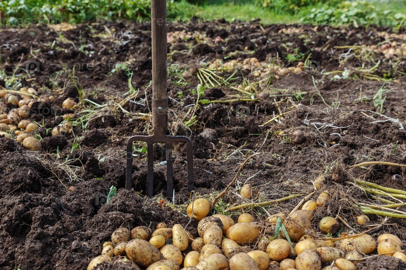 Вилы, торчащие из земли. Выкапывание картофеля. Уборка картофеля осенью