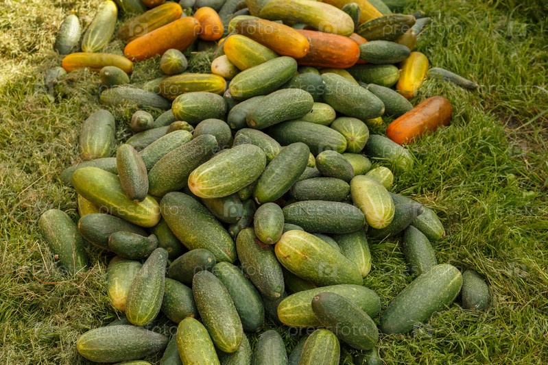 Куча спелых зеленых и перезревших желтых огурцов, лежащих на зеленой траве