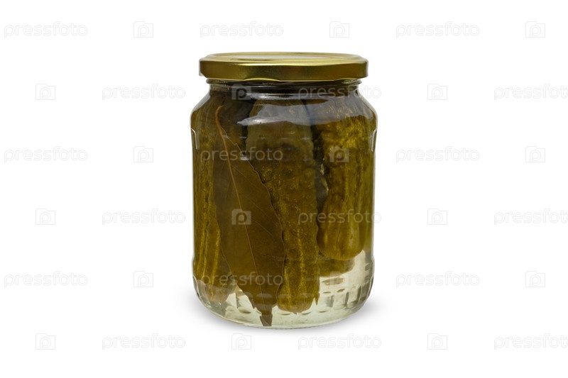 Стеклянная банка с маринованными огурцами на белом фоне. консервированные огурцы