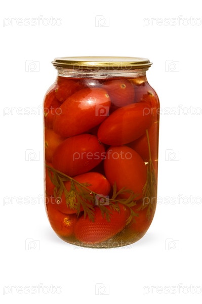 Стеклянная банка с маринованными помидорами на белом фоне. консервированные помидоры