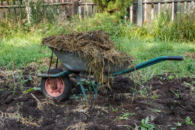 Тачка с навозом крупного рогатого скота. тачка полная соломы и навоза. тачка стоит в саду