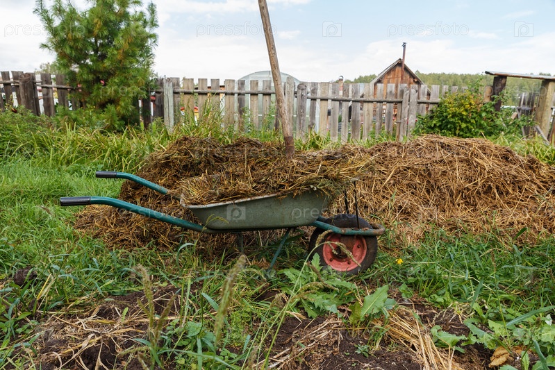 Тачка с навозом крупного рогатого скота. тачка полная соломы и навоза. Тачка стоит возле навозной кучи