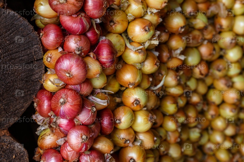 Луковая коса. Желтый и красный лук висят пучками. Уборка лука