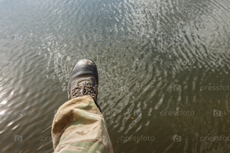 Низкое сечение человека над водой. Левая нога мужчины в камуфляжных штанах и старых ботинках свисает над водой