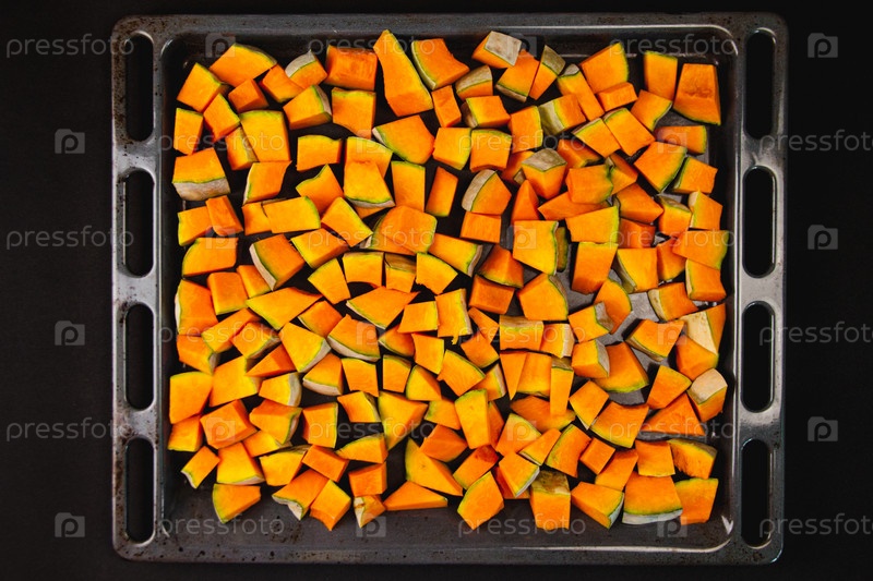 Сырые кусочки тыквы нарезают в противне непосредственно перед отправкой в духовку. Концепция здорового питания, веганская диета