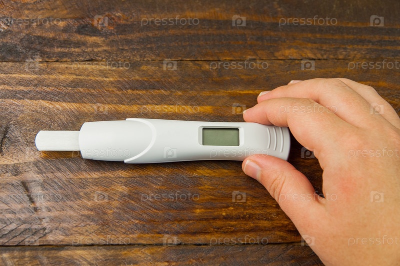 Женская рука на темном деревянном фоне держит цифровой тест на беременность
