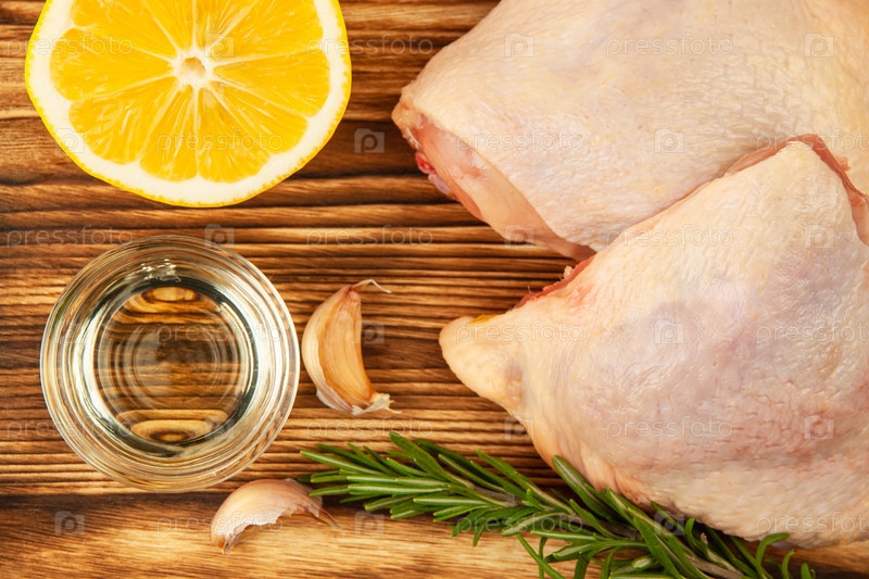 Сырые куриные бедра со свежей веткой розмарина, чесноком, лимоном и маслом на деревенской деревянной доске