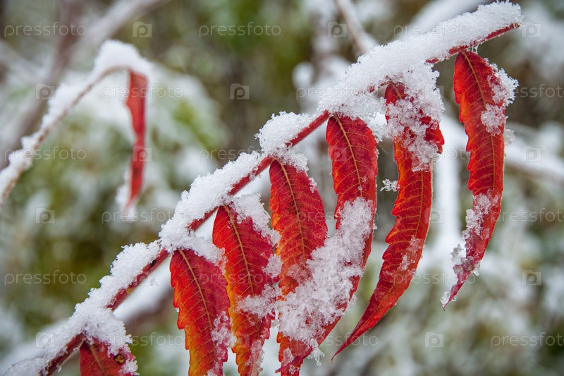 Веточка с красными листьями и первый снег на них. Крупным планом