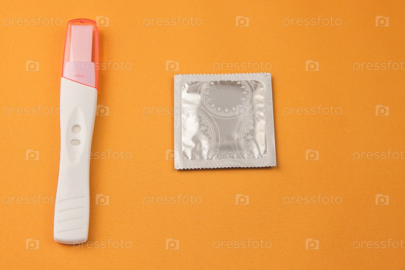 Тест на беременность и презерватив на желтом фоне. Концепция предотвращения нежелательной беременности