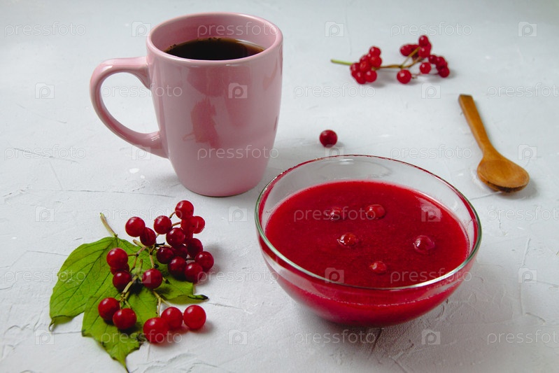 Осенняя композиция с вареньем из калины, ветвями и листьями калины, белым льняным полотенцем, розовой чашкой и деревянной ложкой. Концепция завтрака