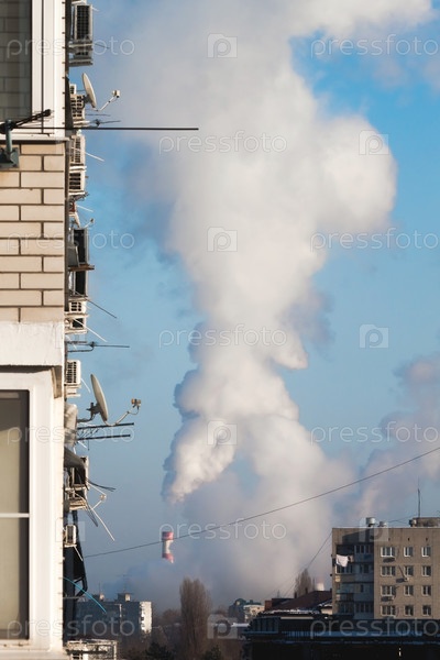 Дым из трубы ТЭЦ на фоне городского пейзажа