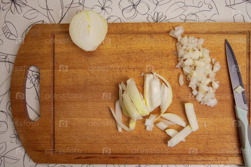 Нож и нарезать кубиками, а луковая соломка лежит на разделочной доске