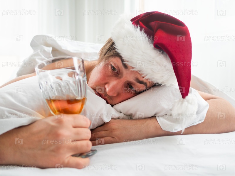 Мужчина в шапке Санты пытается освежиться после вечеринки с алкоголем. У него болит голова после празднования Нового года или Рождества. Тяжелое утро. Отказ от алкоголя. Худшее похмелье