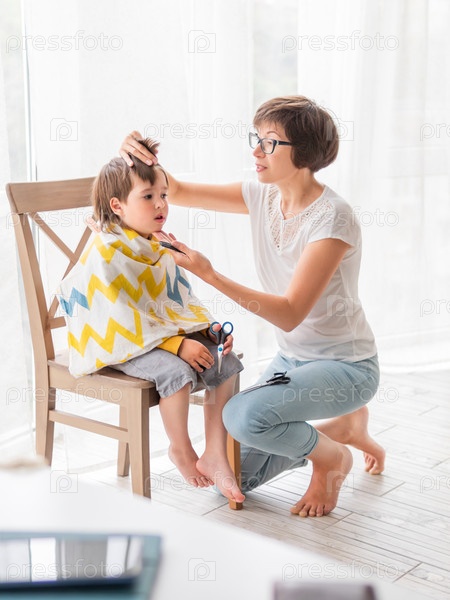 Мать сама подстригает сына. Маленький мальчик сидит, покрытый тканью, и держит ножницы. Семейная жизнь дома