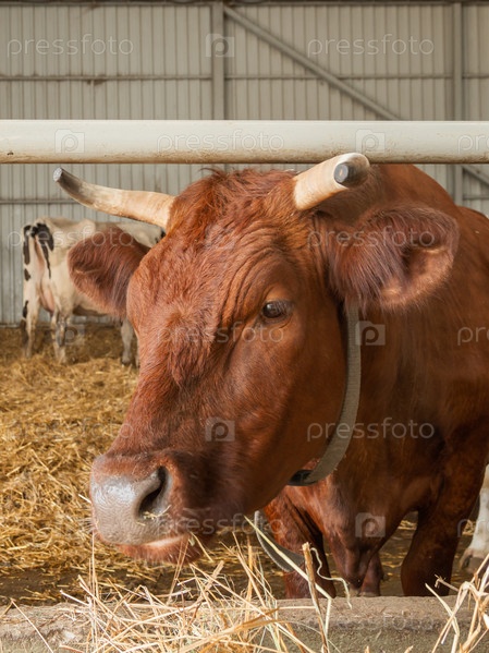 Корова коричневого цвета жует сено. Стадо коров и быков в коровнике. Животноводство. Млекопитающие на ферме