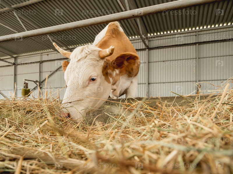 Корова коричневого цвета жует сено. Стадо коров и быков в коровнике. Животноводство. Млекопитающие на ферме