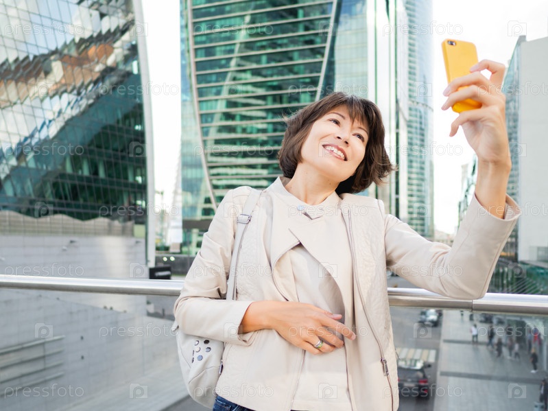 Женщина с желтым смартфоном делает селфи на фоне большого города. Современные здания со стеклянной стеной. Тысячелетний образ жизни