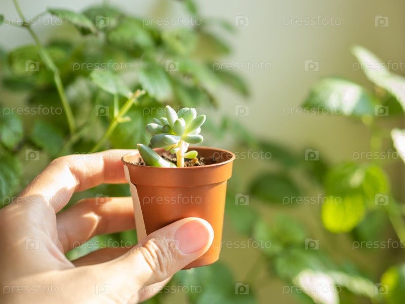 Женщина держит цветочный горшок с небольшим суккулентом. Выращивание и размножение нового растения эхеверии из листа. Горизонтальный баннер с копией пространства