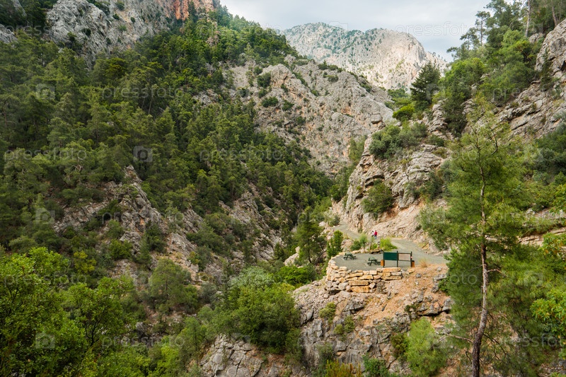 Туристы гуляют по реке в каньоне Гейнюк. Вид с воздуха на горные склоны в прибрежном национальном парке Бейдаглари. Турция