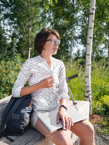 Женщина работает с ноутбуком на деревянной скамейке в городском парке. Летняя жара в городе. Современное рабочее место для фрилансеров. Студент учится онлайн на открытом воздухе