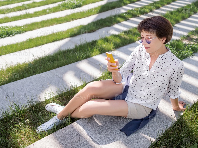 Женщина пишет смс в своем смартфоне, сидя на скамейке в городском парке. Полосатая тень на зеленой лужайке. Современный образ жизни миллениалов