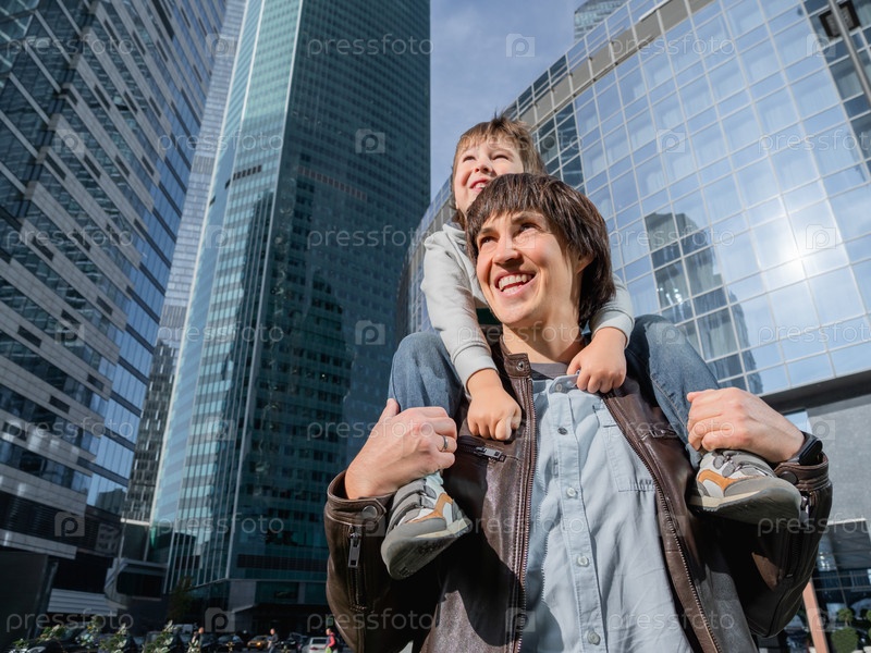 Маленький мальчик сидит на плечах отца среди небоскребов. Папа и сын смотрят на стеклянные стены зданий. Будущее и современные технологии, жизненный баланс и семейная жизнь в благополучных районах