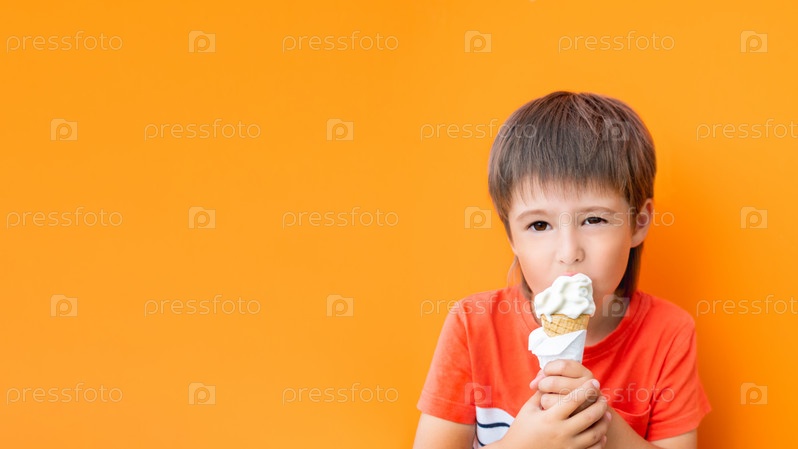 Маленький мальчик ест мороженое на открытом воздухе. Малыш на монохромном, ярко-оранжевом фоне стены. Вкусный холодный десерт летом