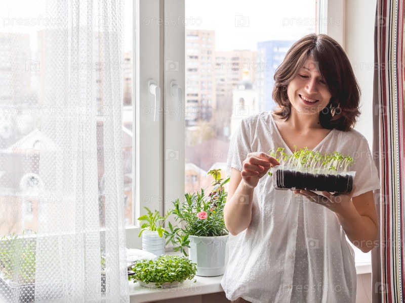 Улыбающаяся женщина смотрит с пластиковой коробкой с микрозеленью. Выращивание съедобного органического базилика, рукколы, микрозелени капусты для здорового питания. Озеленение дома на подоконнике