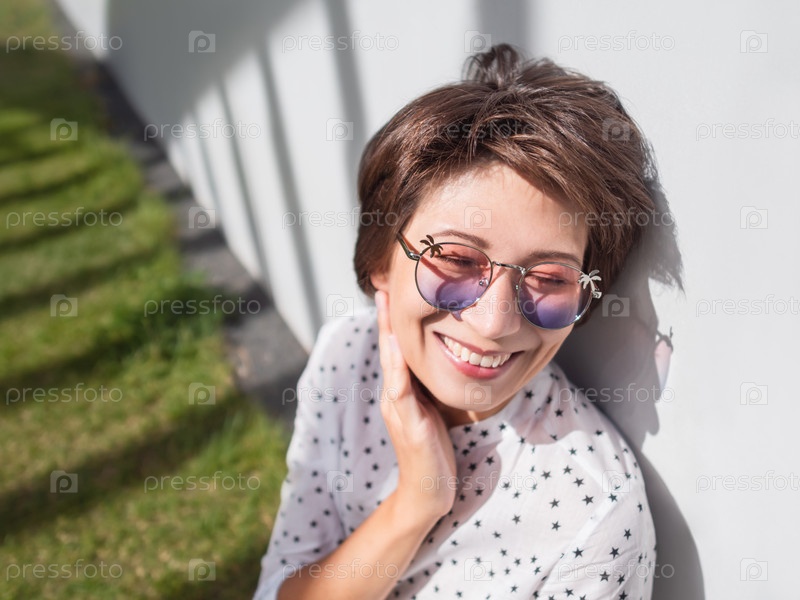 Улыбающаяся женщина в красочных солнцезащитных очках отдыхает на лужайке в городском парке. Природа в городе. Отдохните на свежем воздухе после работы. Летние вибрации