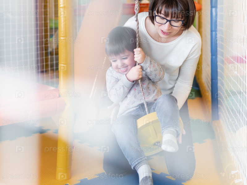 Малыш играет на качелях со своей мамой или няней. Физическое развитие маленьких детей. Интерьер детского сада или детской