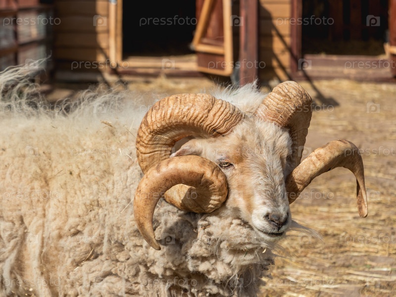 Портрет самца мини-овцы или овца Овиса. Пушистое животное в загоне возле сарая. Животноводство