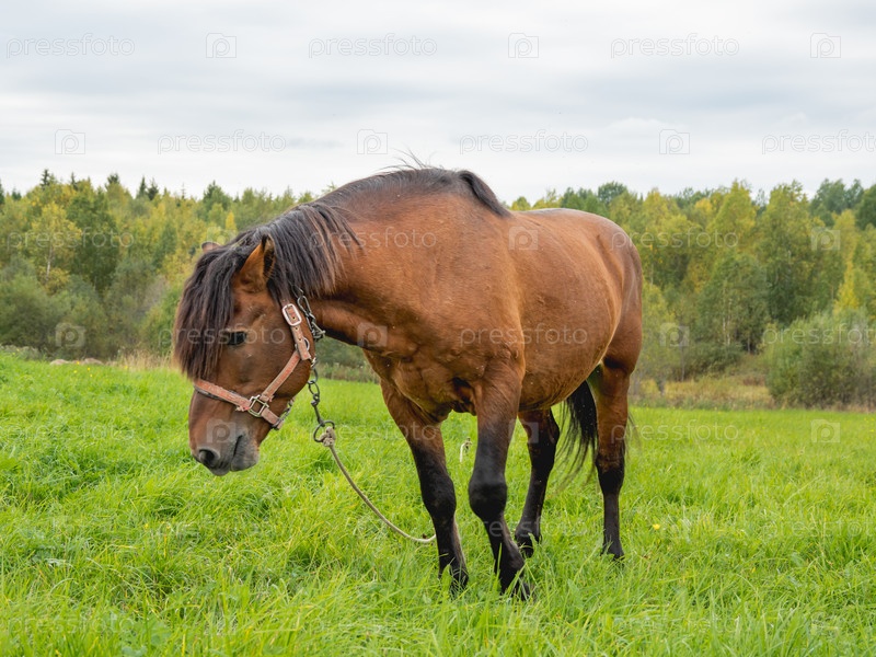 Коричневая лошадь пасется на лугу. Фермерское животное ходит по зеленой траве. Животноводство в сельской местности