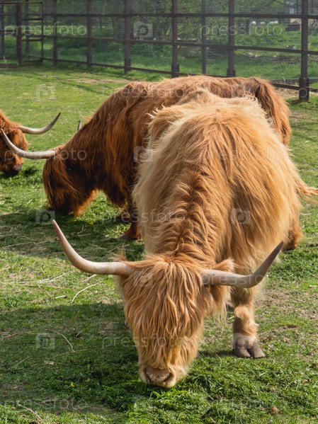 Хайленд шотландская порода деревенского скота. Пушистые коровы едят свежую траву в загоне