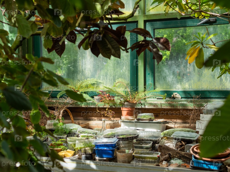 Повторно использованные пластиковые ящики с рассадой в теплице. Рабочее место ботаника с проросшими тропическими растениями в теплице