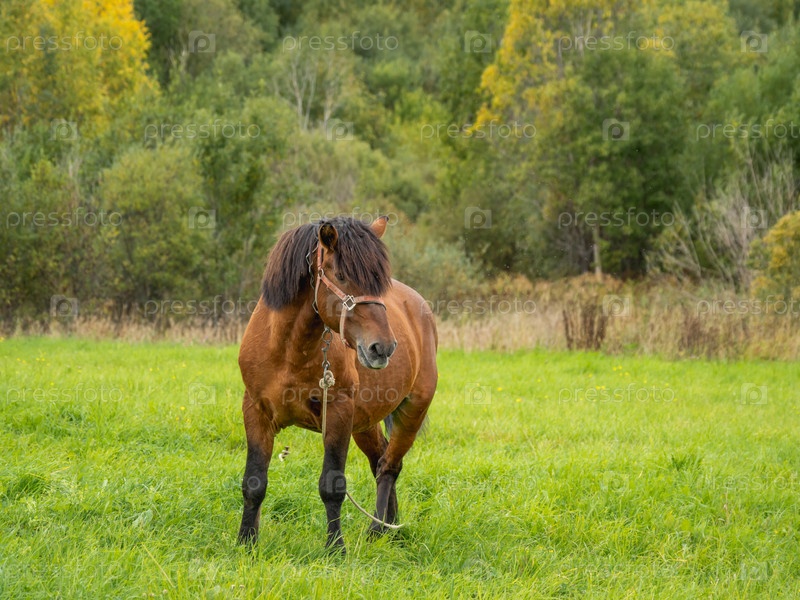 Коричневая лошадь пасется на лугу. Фермерское животное ходит по зеленой траве. Животноводство в сельской местности