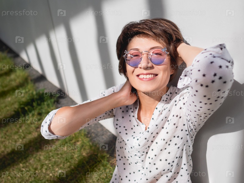 Улыбающаяся женщина в красочных солнцезащитных очках отдыхает на лужайке в городском парке. Природа в городе. Отдохните на свежем воздухе после работы. Летние вибрации