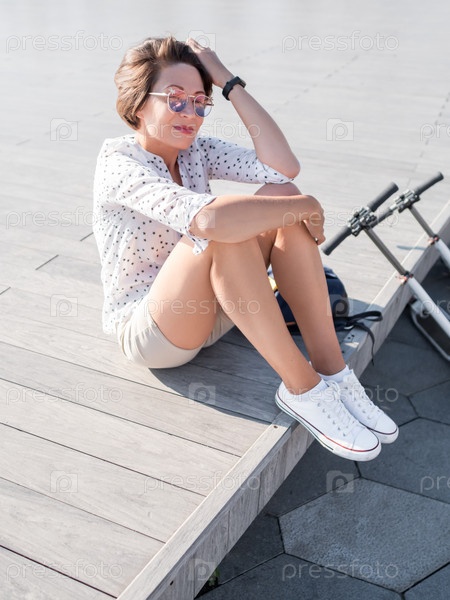 Ветер ерошит короткие волосы женщины в красочных солнцезащитных очках. Улыбающаяся женщина на открытой деревянной сцене. Летние вибрации. Искренние эмоции. Самокат - экологичный городской транспорт
