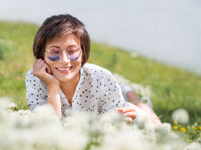 Женщина в красочных солнечных очках нюхает цветы клевера на лужайке в городском парке. Природа в городе. Отдохните на свежем воздухе после работы. Летние вибрации