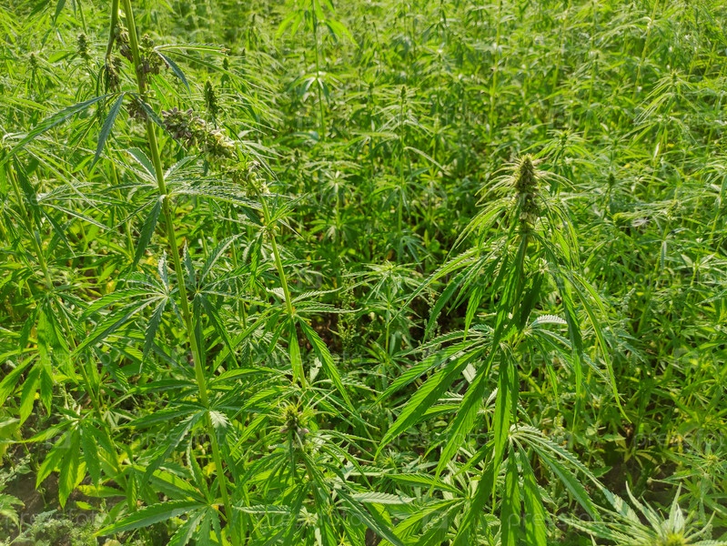 Сельскохозяйственное поле конопли или конопли. Выращивание однолетнего травянистого цветкового растения для промышленных нужд