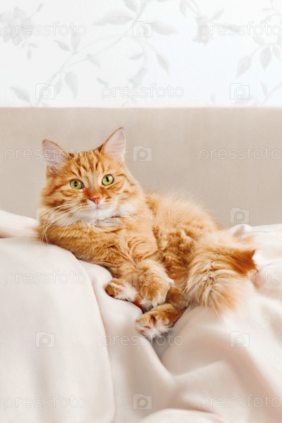 Милый рыжий кот лежит на бежевом диване. Пушистый питомец уютно устроился спать на одеяле. Уютный домашний фон с домашним животным