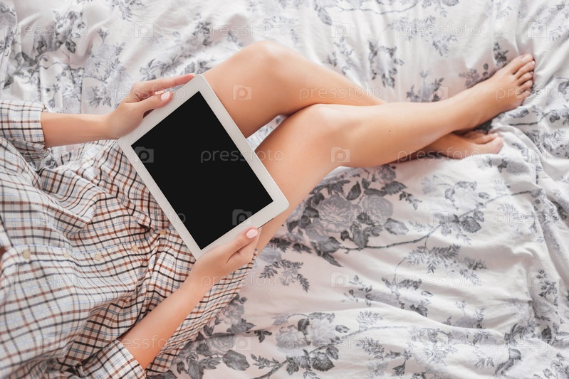 Вид сверху на женщину в пижаме с цифровым планшетом. Проверка электронной почты и чтение новостей на гаджете в постели. Четкий черный экран электронного устройства. Скопируйте пространство или макет