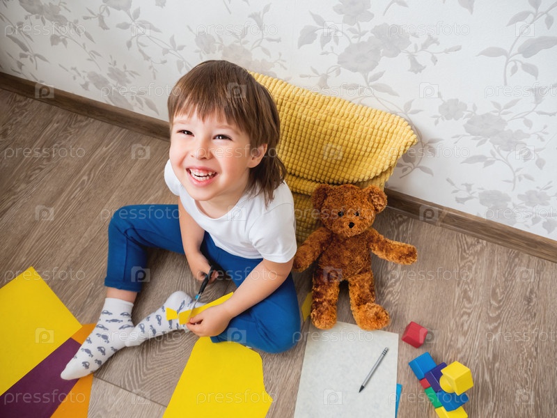 Малыш учится резать цветную бумагу ножницами. Малыш сидит на полу в детской комнате с игрушечными блоками и плюшевым мишкой. Образовательные занятия для детей. Развитие чувственных ощущений и мелкой моторики в домашних условиях